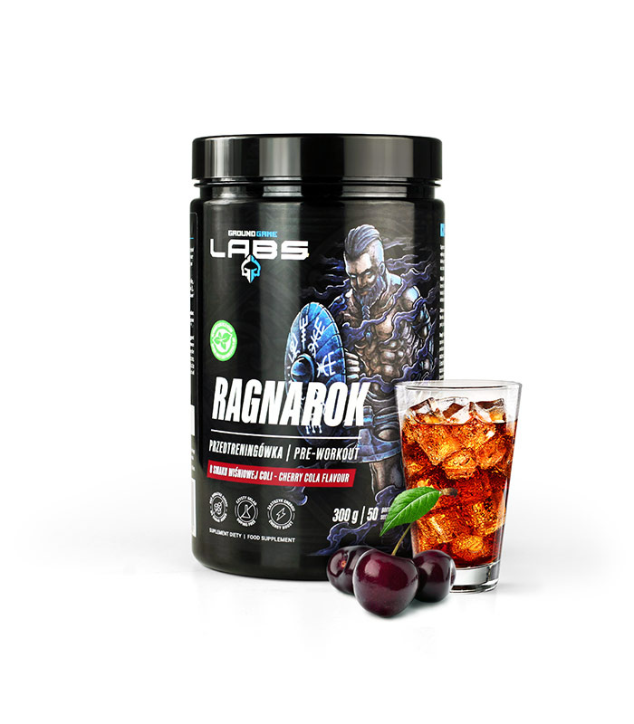 Ragnarok Pre-Workout de la Ground Game Labs este un supliment alimentar cu aromă de cireșe-cola, conceput pentru adulții sănătoși care efectuează activitate fizică de mare intensitate. Suplimentează dieta cu, printre altele, tirozină, taurină, beta-alanină, cofeină, ceai verde și extracte de sfeclă roșie. Conține îndulcitor. Conținut ridicat de cofeină (200 mg/porție). Nu este recomandat copiilor, femeilor însărcinate și care alăptează.